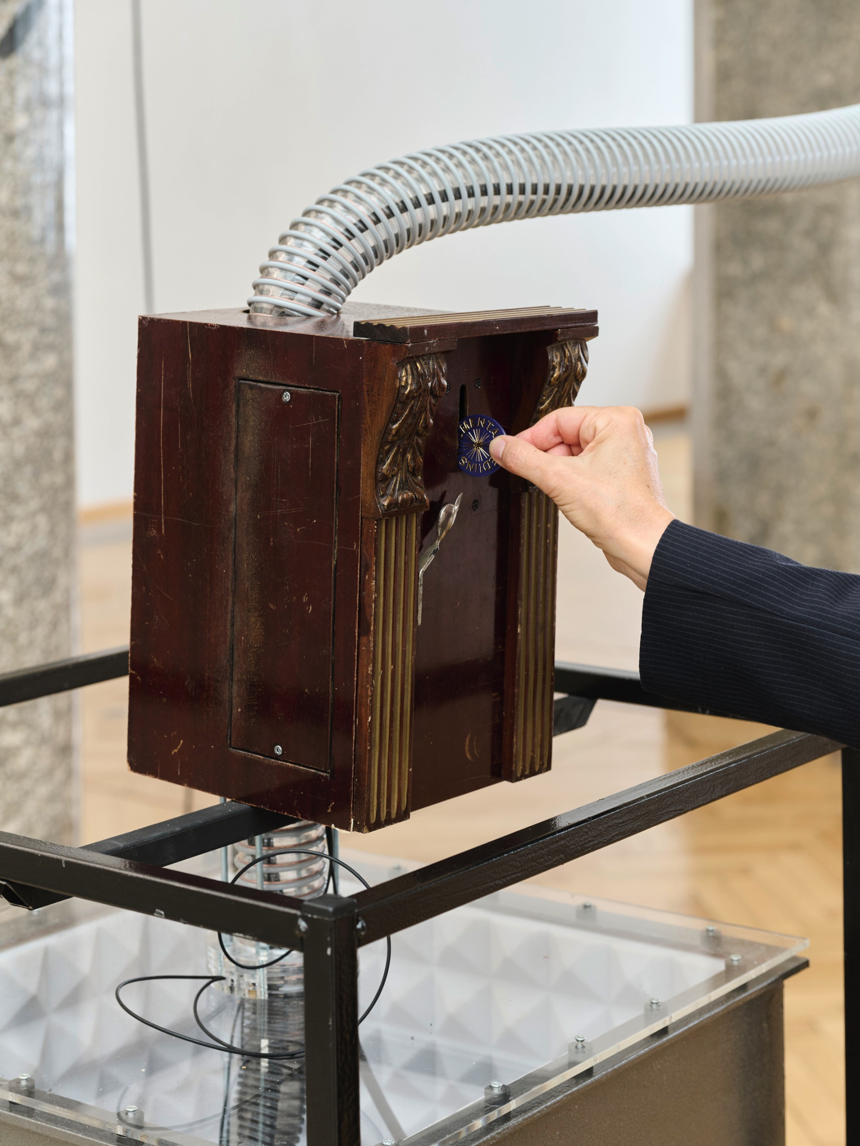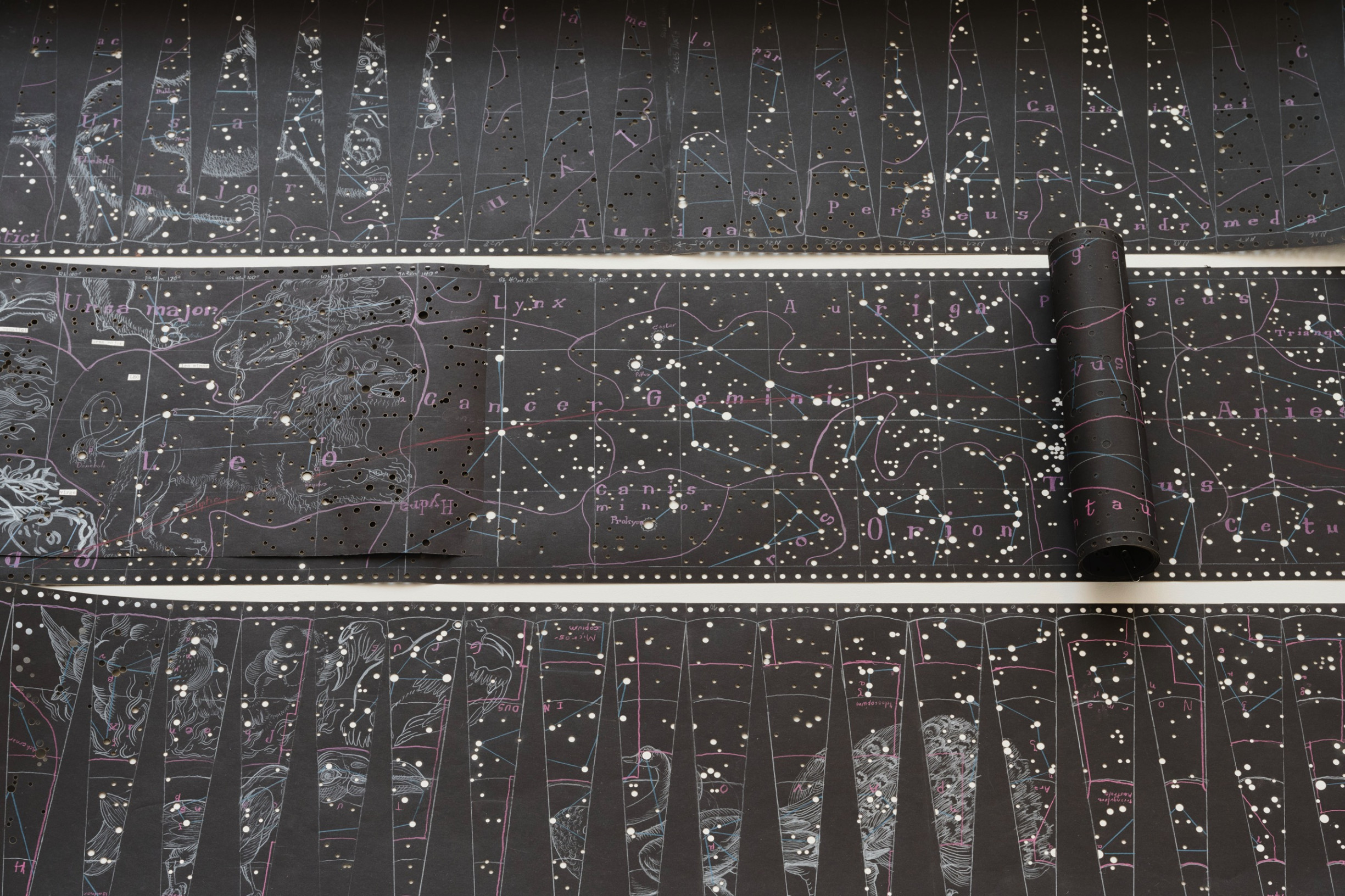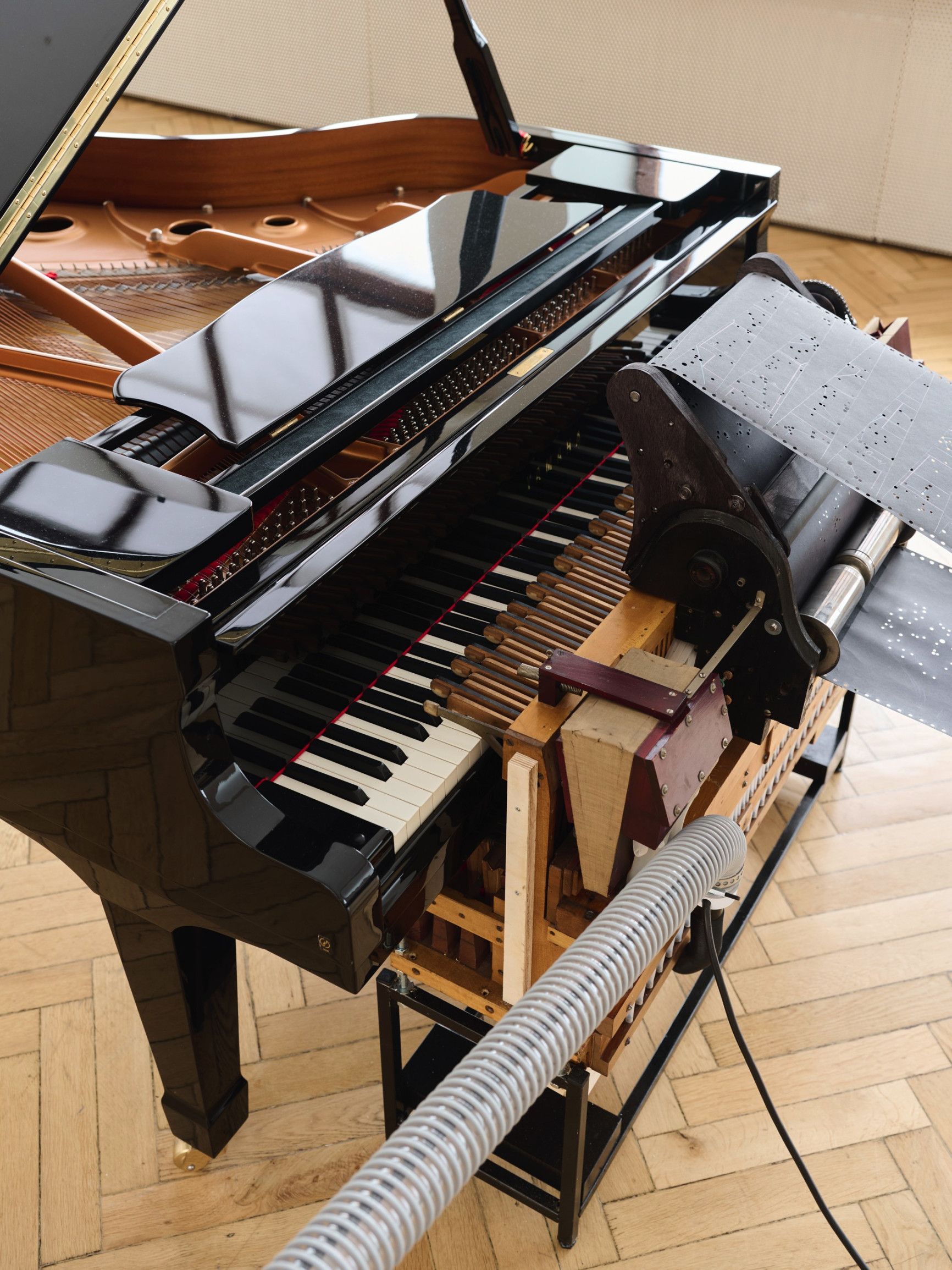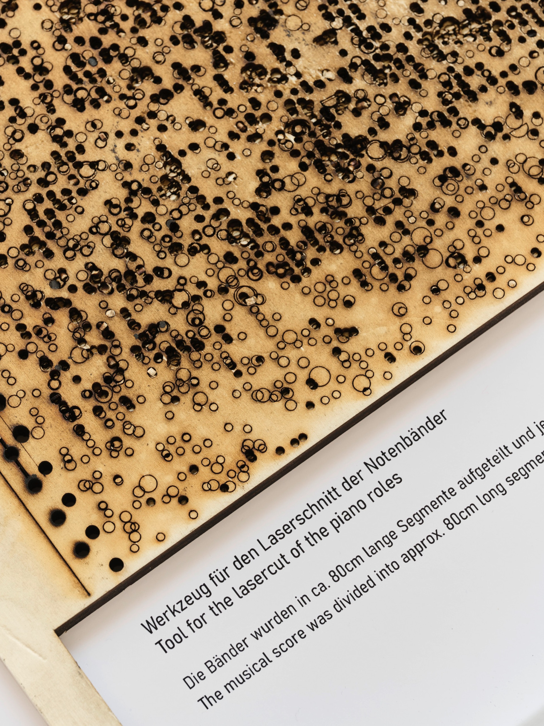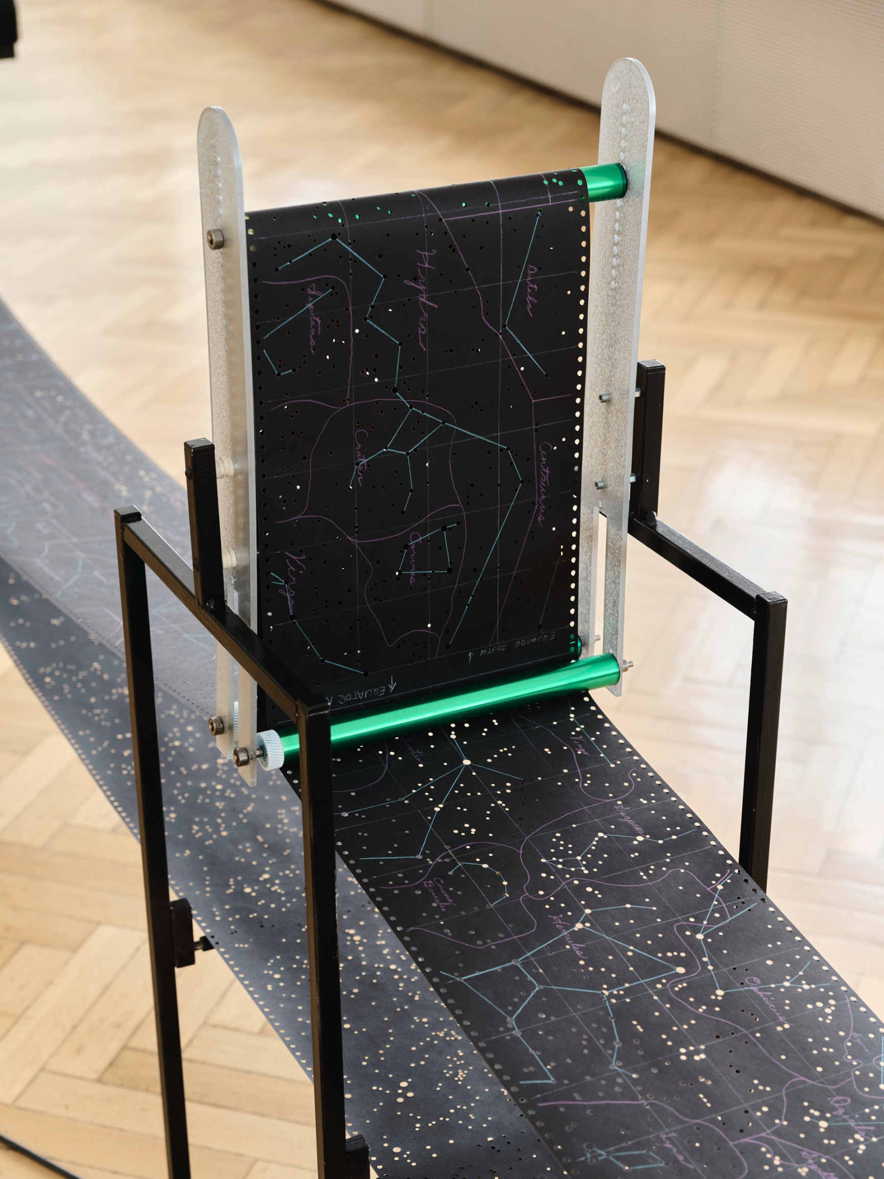 The exhibition INSTRUMENTALIZED! by Beate Engl, Justin Lieberman and Pancho Schlehhuber shows an expansive installation in the Rathausgalerie with a prepared pianola that works without human operation. This unusual apparatus is “programmed” with a paper music roll whose punched-out dots depict a star map of the night sky. At the same time, a light source projects the constellations into the room through the perforated paper roll. The result is a superimposition of delicate, lyrical light effects in the room and a sound reminiscent of the abstract compositions of the early 20th century.